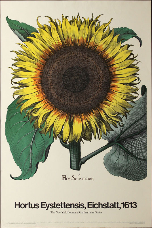 historical illustration of a sunflower, issued in 1971 as part of the New York Botanical Garden Print Series. This illustration comes from the 1613 book Hortus Eystettensis, illustrated by Basilius Besler and printed in Eichstatt, Germany.