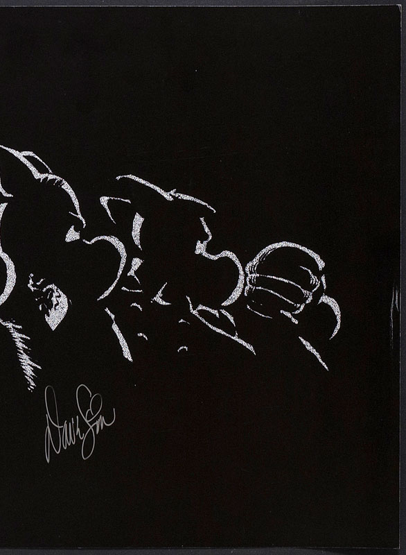 A rare print given out to the few attendees of the one and only Cerebus Convention. Petunia Con 84 was held in Oakland California April 20-22, 1984. The print features 6 Silhouettes of the different phases of Cerebus, warrior, prime minister, barbarian, politician etc. It is signed in silver ink by Dave Sim and measures 17" x 10" black and white and printed in Canada