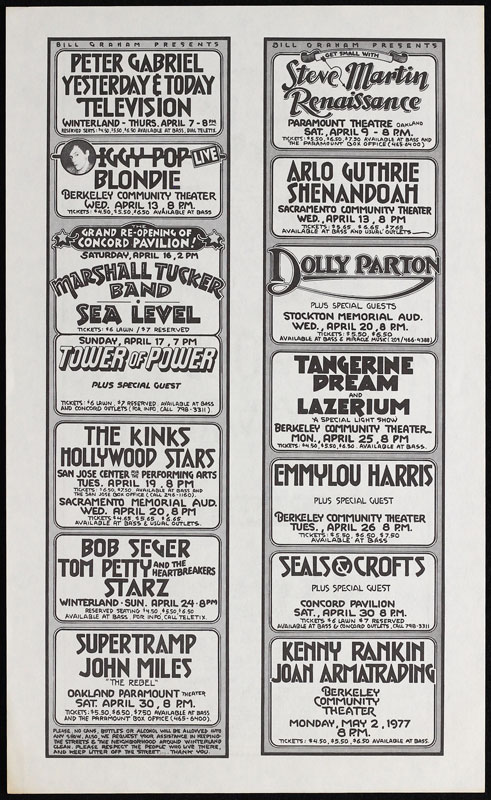 This is the rare handout with the Bill Graham Presents Schedule on back from 4/4/77 to 5/2/77 including Peter Gabreil, Iggy Pop, Blondie, Marshall Tucker Band, The Kinks, Bob Seger, Tom Petty,Tower of Power, Supertramp, Steve Martin, Arlo Guthrie, Dolly Parton, Tangerine Dream, Emmylou Harris, Seals & Crofts, Kenny Rankin, and Joan Armatrading