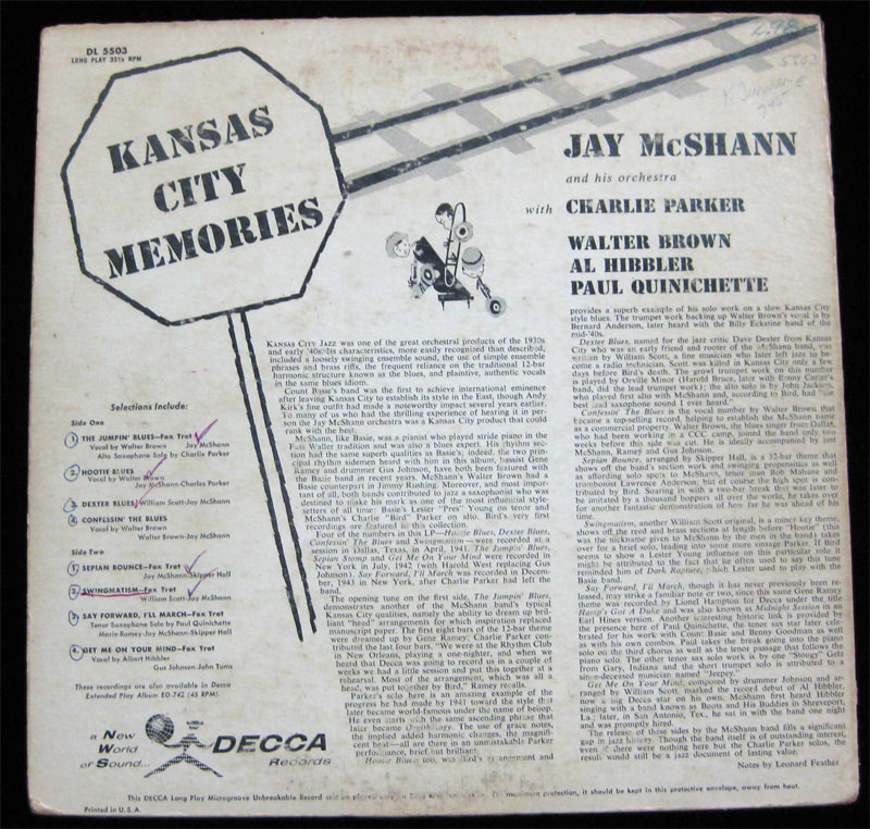 Jay McShann And His Orchestra With Charlie Parker, Walter Brown, Al Hibbler, Paul Quinichette - Kansas City Memories Vinyl LP